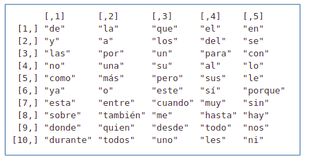 En R, el paquete tm brinda una lista de 308 stop-words del español. Se filtrarán estas palabras, así como palabras que aparecen con mucha frecuencia y que son irrelevantes: “ee”, “nn”, “oo”, “aa”, etc.