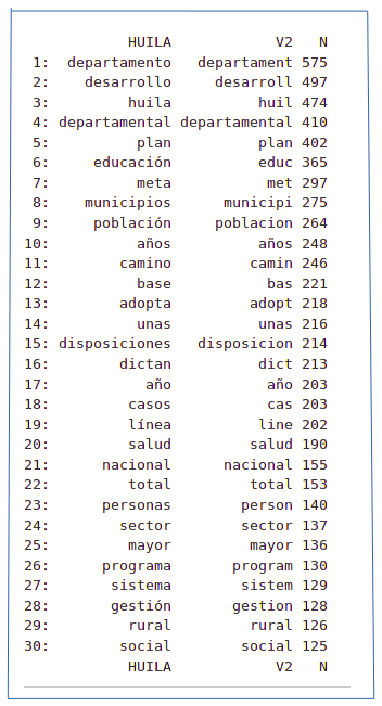 Utilizando el algoritmo de stemming de Porter y tomando como ejemplo las 30 palabras más mencionadas del Plan de Desarrollo del Huila encontramos las siguientes comparaciones.