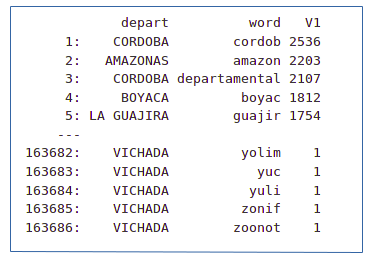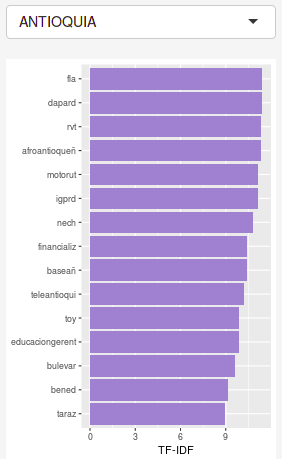 La variable q contiene la frecuencia ponderada por el TF-IDF de cada palabra. La variable q_melted es la misma variable q reducida a 3 columnas. A continuación las palabras más relevantes de cada departamento luego de ponderar por TF-IDF.