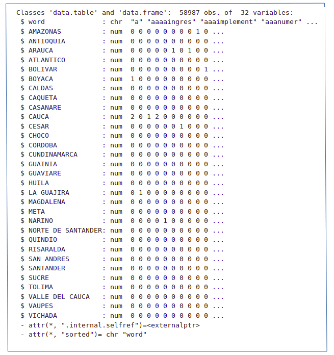 print(d$HUILA[, .N, keyby = HUILA][order(N, decreasing = T)][1:30,.(HUILA, stemDocument(x = HUILA, language = "es"), N)])