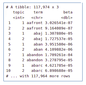 Se comenzará con el análisis por-tópico-por-palabra extrayendo las probabilidades o β (“betas”) del modelo.