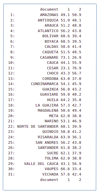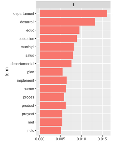 Cada uno de estos valores es una proporción estimada de palabras que vienen de ese documento que son generadas por ese tópico. Por ejemplo, el modelo estima que el 76.9% de las palabras del PDT de Cesar construyen el tópico 2 mientras que el 73.1% del PDT de Casanare conforman el tópico 1.