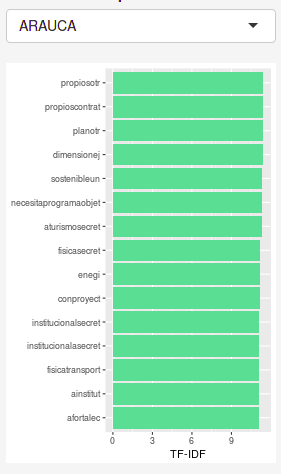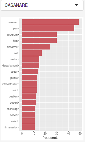 En los documentos está el reto de lidiar con las palabras pegadas. Por ejemplo, en Casanare hay palabras como “culturaprogram”, “comunitarioprogram”, “deportivosector” y “firmesector”. En Arauca sucede algo similar: “propiosotr” haciendo alución a “propios otros” y “físicasecret” haciendo alución a “física secreto”. Estas inconsistencias podrían comprometer la calidad de análisis entre documentos.