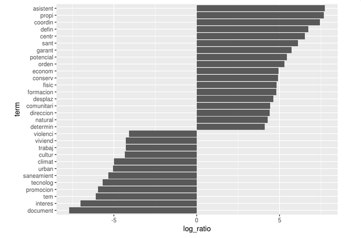 Como una alternativa, se podría considerar palabras que tuvieron la mayor diferencia de betas (β) entre tópico 1 y tópico 2. Esta se puede estimar usando el logaritmo del radio entre ambos parámetros. Para limitarlo a un grupo de palabras especialmente relevantes, se filtra por las palabras comunes, como aquellas que tienen una probabilidad (beta) mayor a (1/1000) en al menor un tópico. A continuación las palabras con las mayores diferencias entre los dos tópicos.