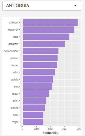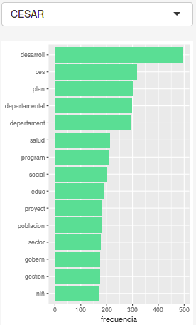 Filtra por los departamentos. Cada departamento resalta las 15 palabras (raíces) más mencionadas en cada Plan de Desarrollo.