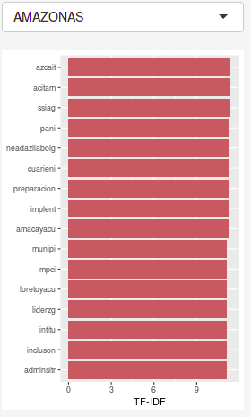 Los PDTs que mejor describen el tópico 1 son Casanare, Vaupés, Huila, Risaralda, Córdoba y Sucre. Resalta la diferencia que existe entre Casanare con un 73.1% respecto a Vaupés (66.6%) y Huila (63.9%). Cuando se retorna a la vista por PDT ponderado por TF-IDF, Casanare resalta de nuevo las palabras “saludsector” y “comunitarioprogram” e infiere una conexión de este tópico con salud.