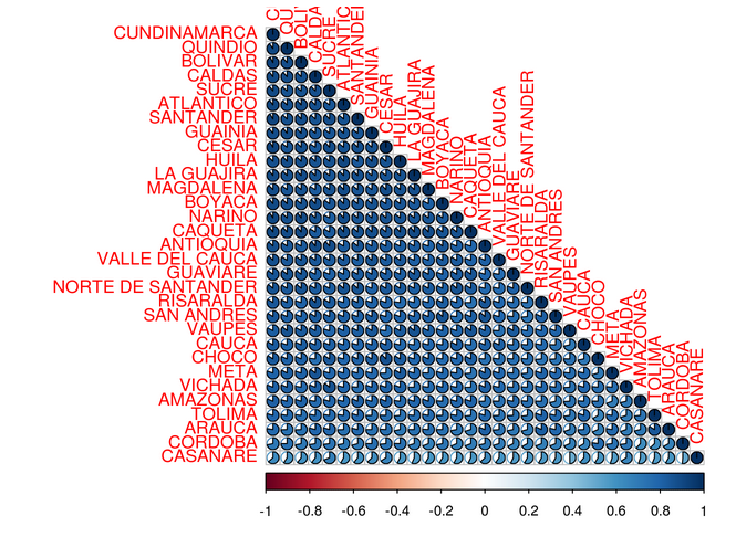 La matriz de correlación se ordenó por compomentes principales y por eso aparecen primero los departamentos con mayor correlación y de último los de menos. Se resalta los siguientes hallazgos: