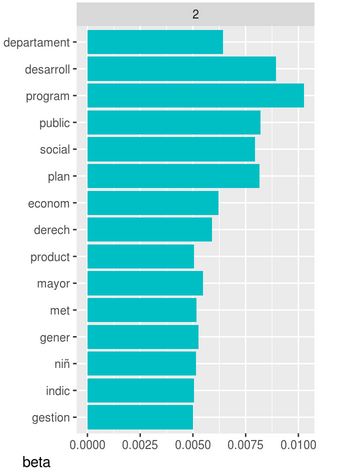 Esta gráfica permite entender los dos tópicos que fueron extraidos de los PDTs. Las palabras más comunes en el tópico 1 incluyen “población”, “salud”, “implementar”, “proces”, “indic” lo que puede sugerir que están más enfocados a la implementación de proyectos de salud. Aquellas palabras más comunes en el tópico 2 incluyen “social”, “econom”, “derech”, “genero” y “niñ” infiriendo una inclinación hacia estrategias de interacción social (niñez, género, derecho) ajenas a la salud. Aquí se resalta una ventaja del modelaje de tópicos opuesta a los métodos de “conglomerados duros”: lo tópicos en lenguaje natural se pueden superponer en términos de palabras.